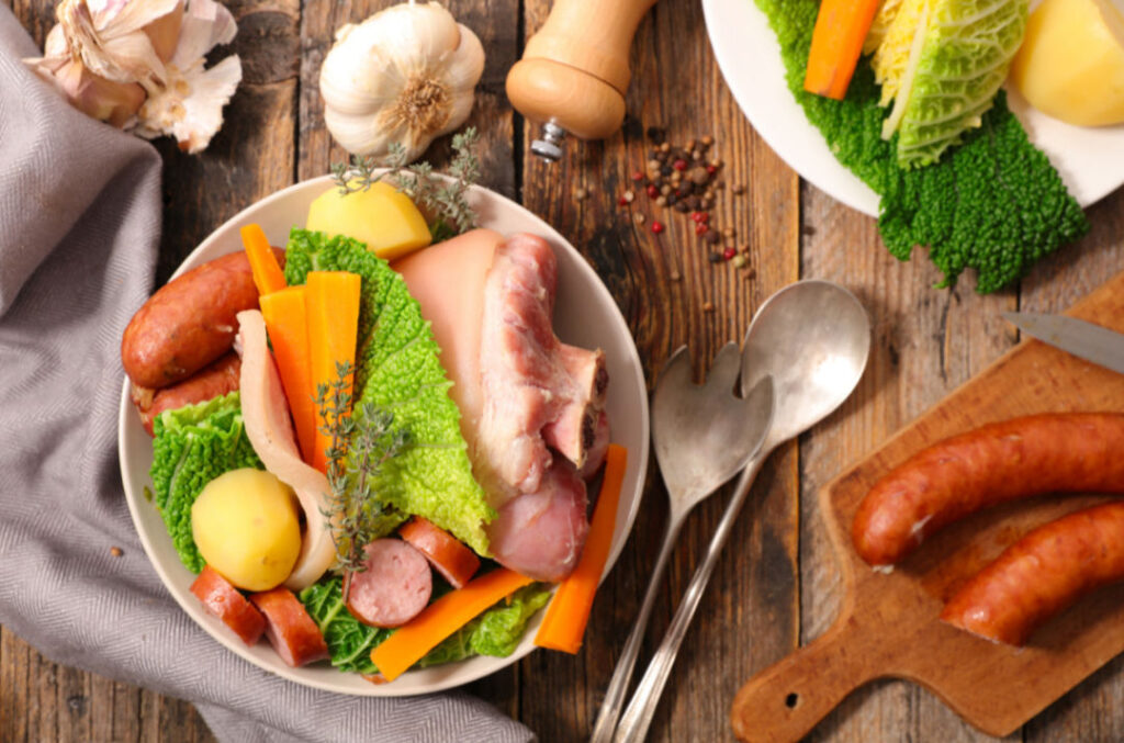 Potée auvergnate is a hearty stew made with pork belly, ham hocks, sausages, potatoes, cabbage, and leeks. This dish is a classic example of the rustic, comforting cuisine of the Auvergne region and is typically enjoyed during the colder months.