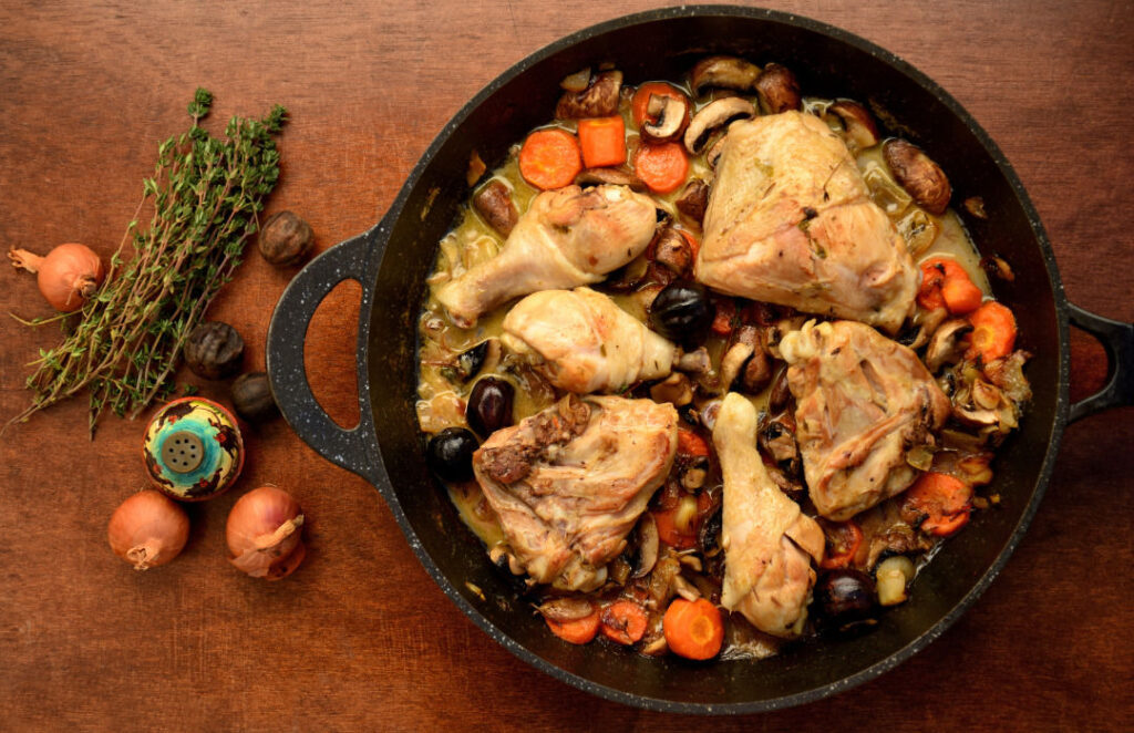 One of the most iconic dishes native to the Bourgogne-Franche-Comté region of France is “coq au vin”. This classic dish consists of chicken braised in red wine, bacon, mushrooms, onions, and garlic, and is typically served with boiled potatoes or a crusty bread. The Burgundy region is known for its rich, full-bodied red wines and flavourful dishes made with fresh local ingredients.