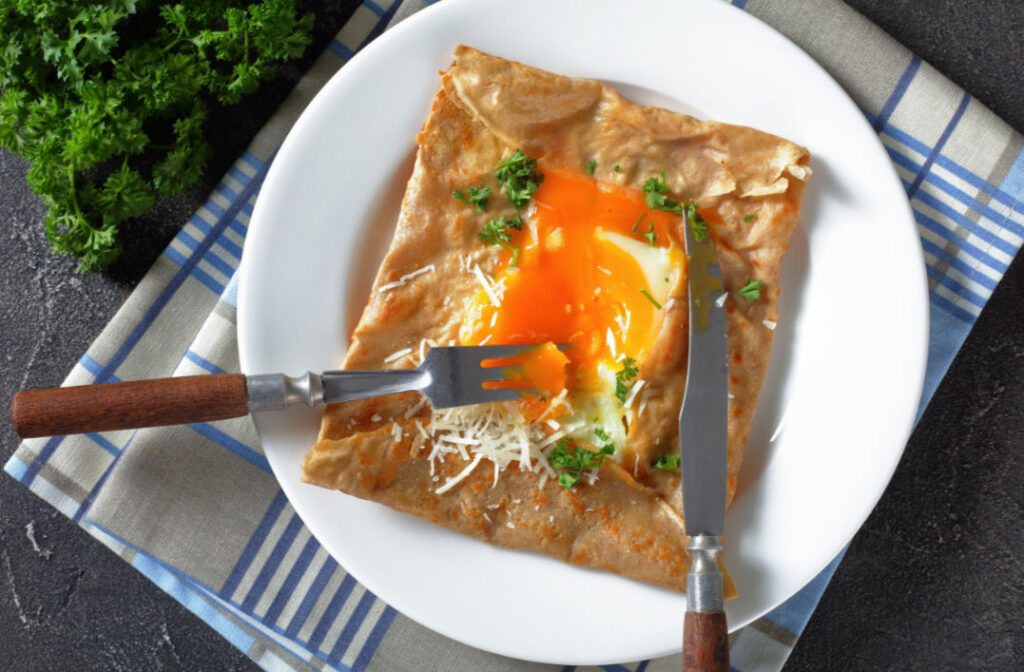 The Galettes Bretonne is a thin, crepe-like pancakes made from buckwheat flour, salt, water, and sometimes milk. They are typically savoury and filled with ingredients such as cheese, eggs, ham, and mushrooms, and served as a main dish. Another iconic dish from Brittany is “croustillant de sarrasin”, which is savoury turnover often comprised of ingredients such as ham and cheese or cream cheese and salmon.